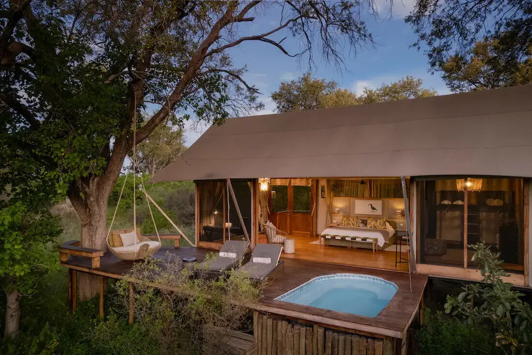 At Vumbura, safari revenue directly supports communities. This lodge operates on land leased from the Okavango Community Trust, ensuring that funds flow back to the villages that own it. This critical joint venture has lasted for decades, demonstrating that ecotourism can be locally empowering. The camp itself is striking in its design, set amongst floodplains and woodlands, with activities ranging from dreamy mekoro excursions to hot-air ballooning. Tented suites float above the floodplains, each with private plunge pools and floor-to-ceiling windows that dissolve the boundary between chic indoors and Delta wilderness. Here, every night spent cosily in the wild contributes to livelihoods far beyond the reserve.