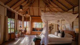 Tucked under shady trees along the Nile River, Baker’s Lodge recalls the romance of early exploration with its thatched cottages and open-air central lounge. Ten spacious suites, built on raised wooden decks, enjoy private riverfront views where hippos wallow and sunsets light up the water. Guests can cool off in the pool, take a boat upriver to the base of Murchison Falls, or head out on game drives across the park’s savanna. With its tranquil setting and attentive service, Baker’s Lodge is as relaxing as it is adventurous.