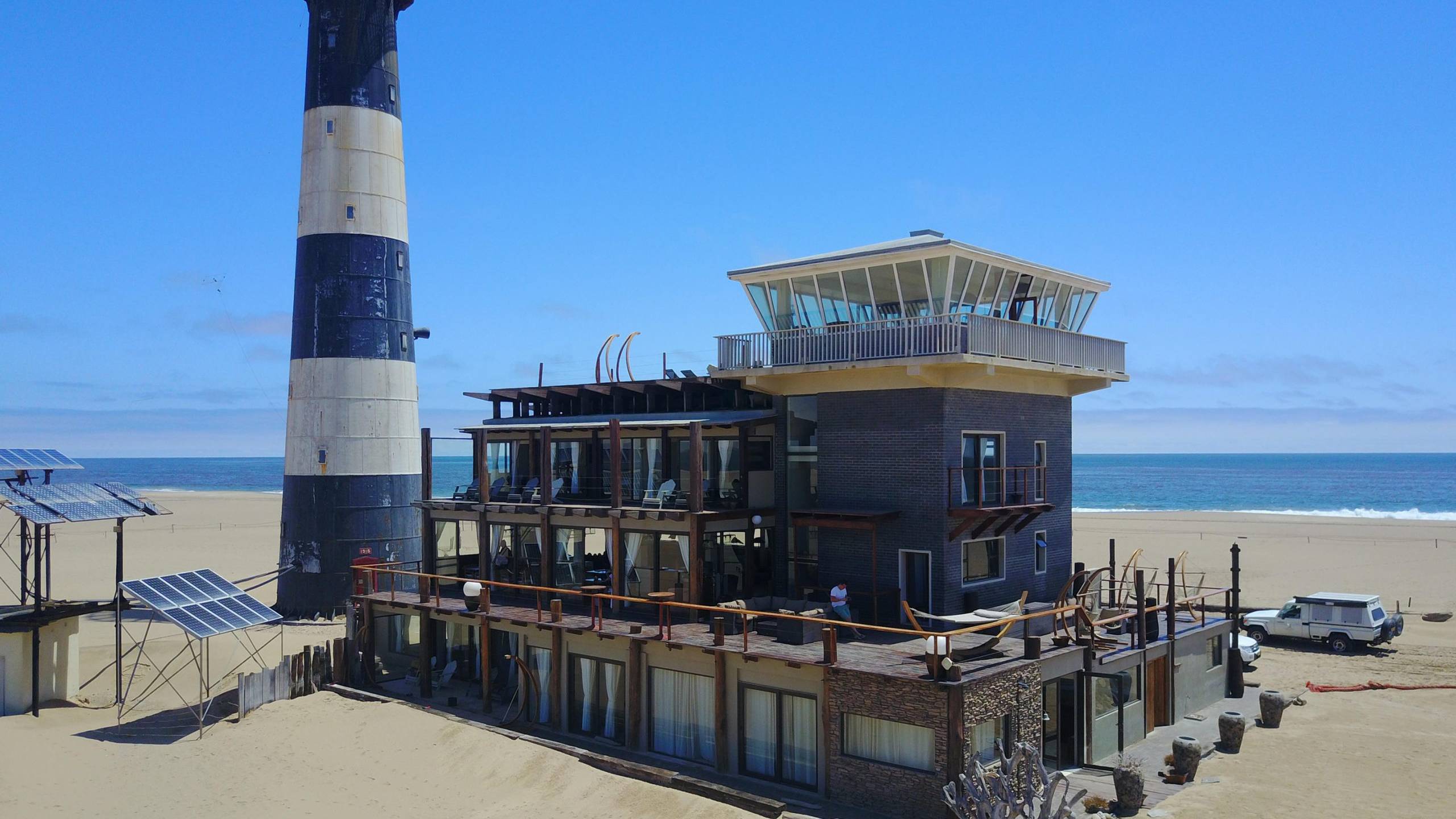 Remote lighthouse lodge on a peninsula near Walvis Bay, surrounded by marine and bird life.