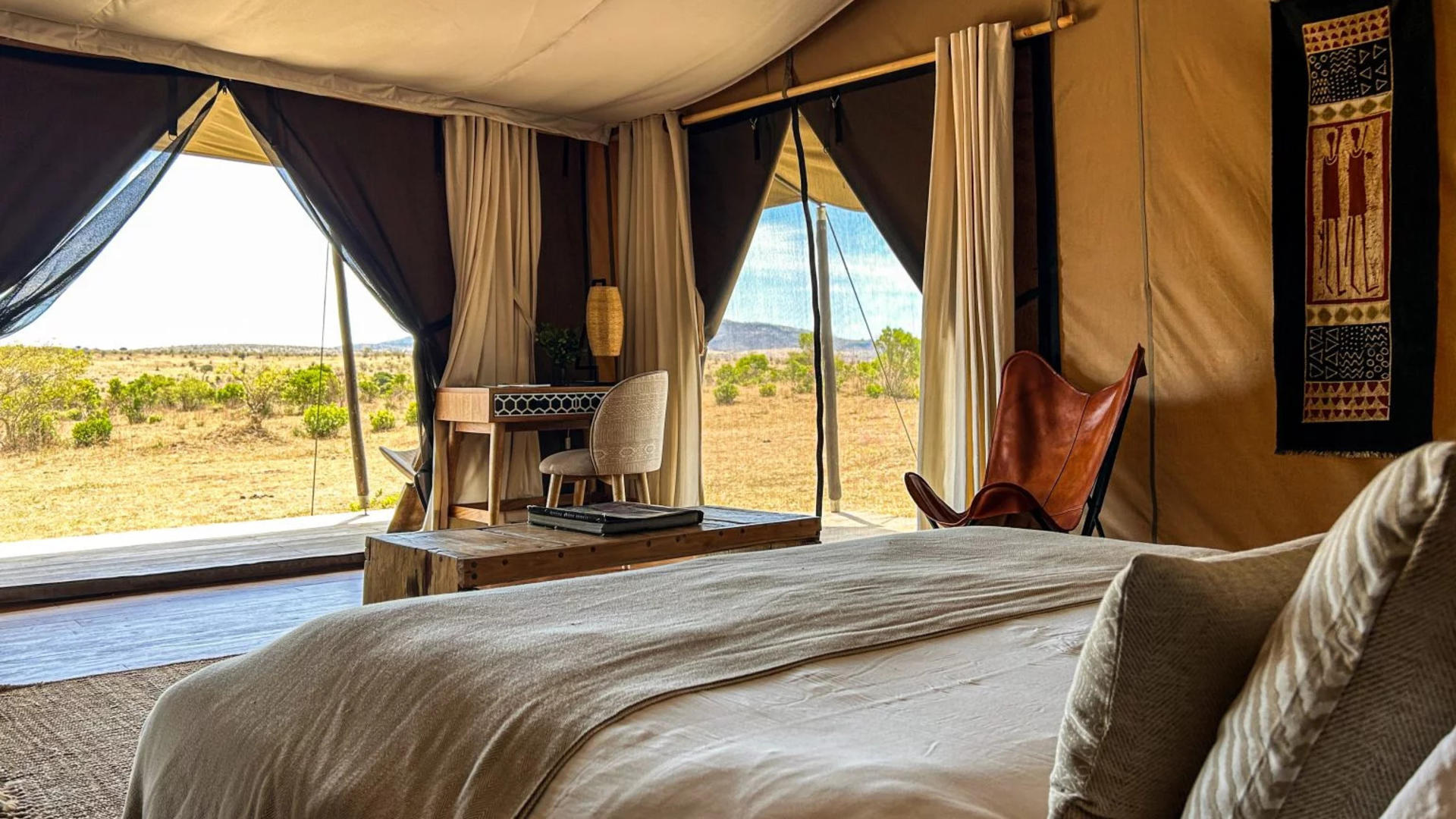 After breakfast, board a short flight deeper into the Masai Mara for your stay at Enkewa Camp. Here, you’ll be guided by Dominic Mataany and James Hendry, whose knowledge and storytelling bring depth to every sighting. For three nights, enjoy privately guided safaris, meals and drinks included. Between drives, relax in camp and soak up the sounds of the wild, before evenings of conversation and firelight.