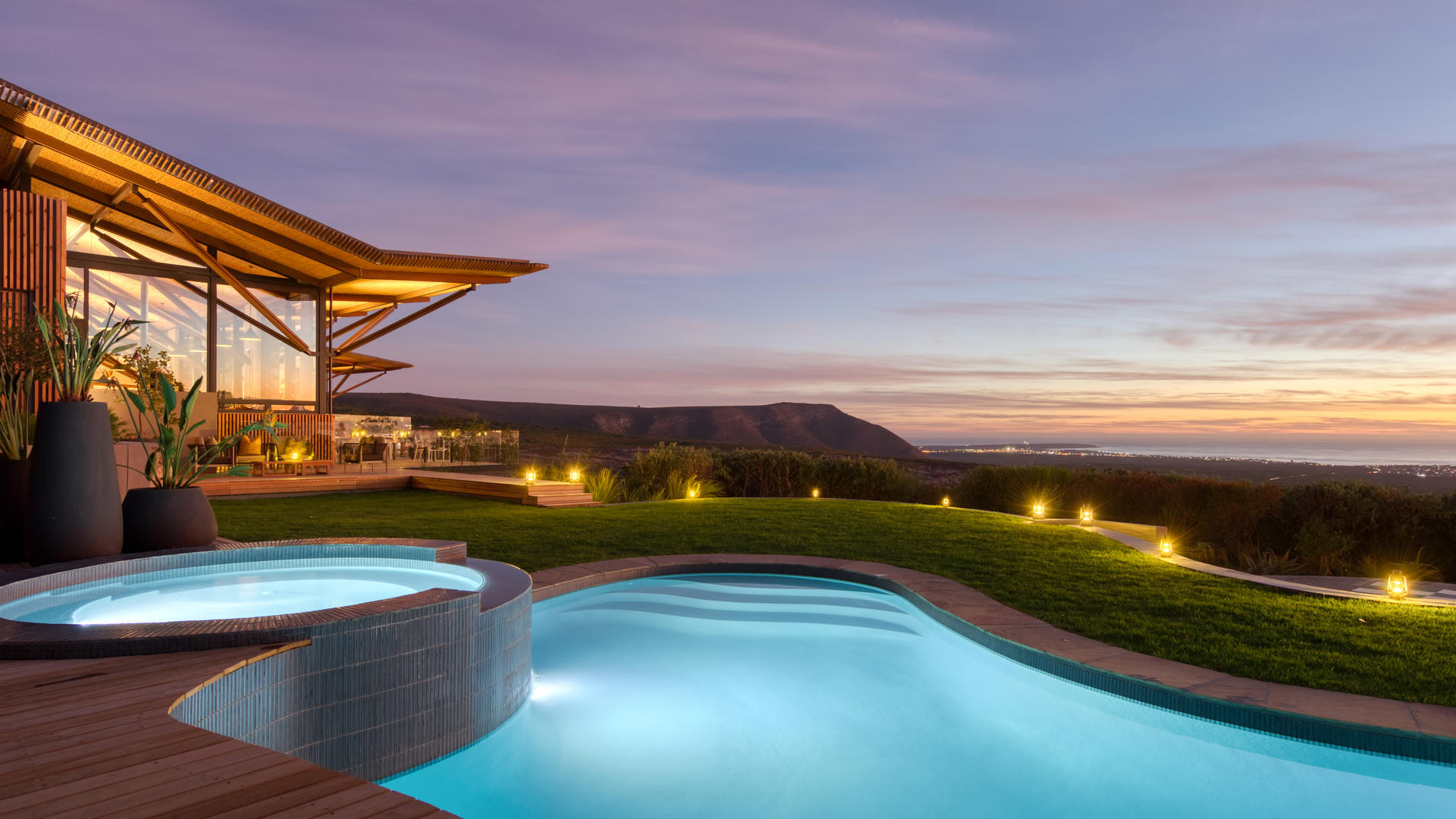 Nestled between mountain and sea, Grootbos Private Nature Reserve is a five-star eco-paradise showcasing the incredible Flora and Marine life of the Southern Tip of Africa. Home of the “Marine Big 5” – whales, sharks, dolphins, seals and penguins; and with unparalleled floral diversity, Grootbos offers you a one-of-a-kind luxury African experience. Nestled carefully into the natural gaps of an enchanted Milkwood forest, the 11 freestanding suites are stylishly furnished with luxurious canopy beds, spacious en suite bathrooms, separate lounges with cosy fireplaces and private wooden decks with spectacular panoramic views. True to its name, the warm and welcoming Garden Lodge is set amongst an Eden of beautifully landscaped fynbos gardens and indigenous trees. Fashioned from stone, thatch and timber, the Garden Lodge reflects African warmth with an intercontinental twist, blending perfectly into the surrounding landscape. The curved lines, high beamed ceilings and endless windows enhance the sensation of light, freedom and natural flow and make full use of the incredible sweeping views across mountain and sea. An elegant restaurant, spacious lounge, beauty salon, library and children’s entertainment room ensure that all needs are satisfied. The wooden deck, terrace and superb pool area extend the interior space into the outdoors allowing sun seekers and nature lovers to make the most of the rejuvenating environment.
